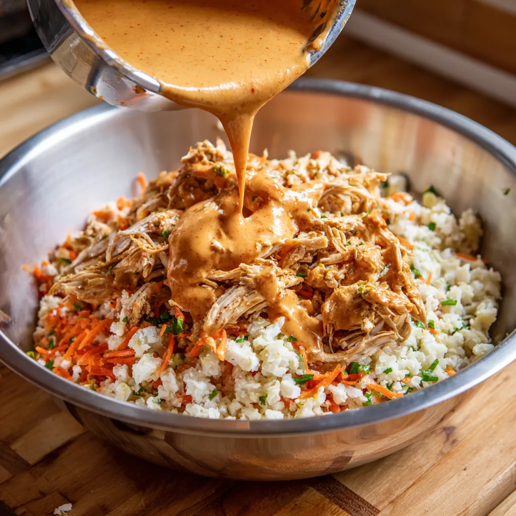 In a large mixing bowl, combine shredded chicken, cauliflower rice, celery, carrots, onion, and garlic. Stir gently to distribute evenly.